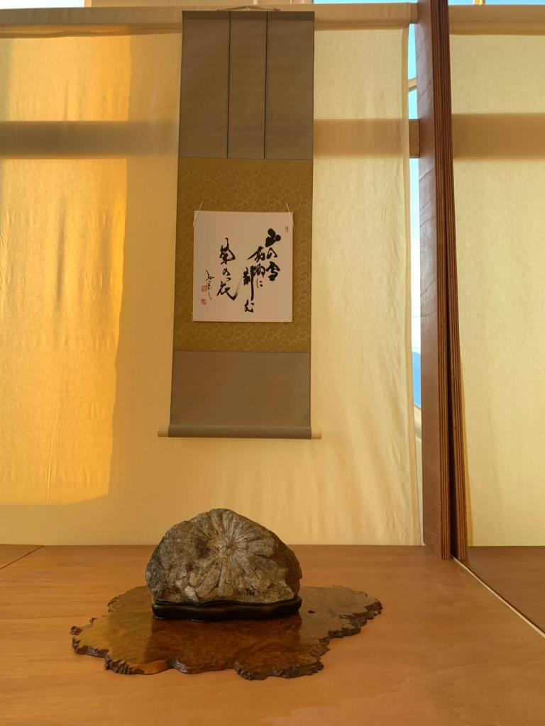 Pietra giapponese acquistata online da un commerciante giapponese nel 2019. 菊花石 pietra crisantemo per il fiore di crisantemo ben visibile. Le pietre crisantemo sono un tipo di pietre chiamate kikka seki, pietre con disegno a forma di fiore di crisantemo.