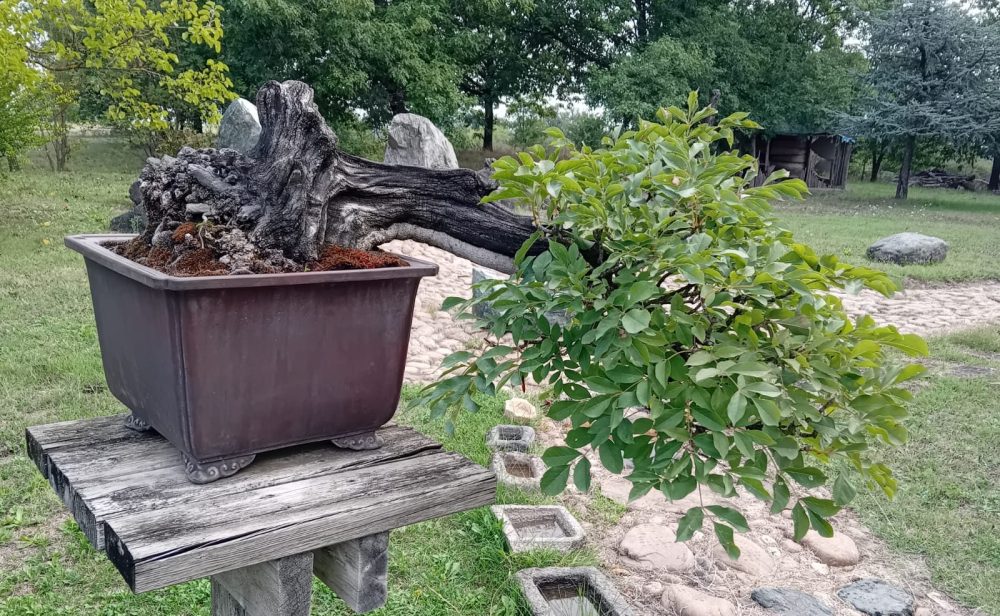 Un altro amico mi lasciò un vaso di grandi dimensioni. Ho creato un bonsai accettabile, usato nel giardino bonsai come soggetto isolato, come se fosse un “guardiano” della collezione più esterna. Importante da segnalare che il legno, lavorato a suo tempo, appare oggi vecchio e logorato, come una “scultura” lasciata alle intemperie. La chioma è in ottima situazione con rami ben impostati.