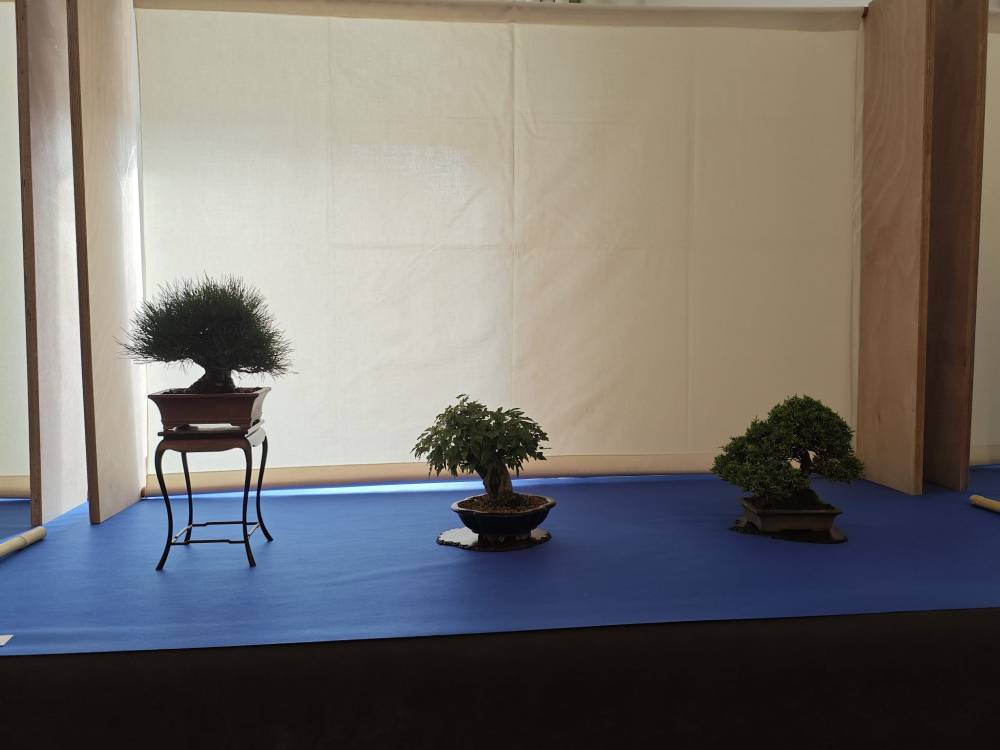 Composizione Shohin (ossia di piante con altezza non superiore ai 25 cm) a tre elementi composta da Ginepro Itoigawa, Acero Burgeriano su roccia e Pino Nero.