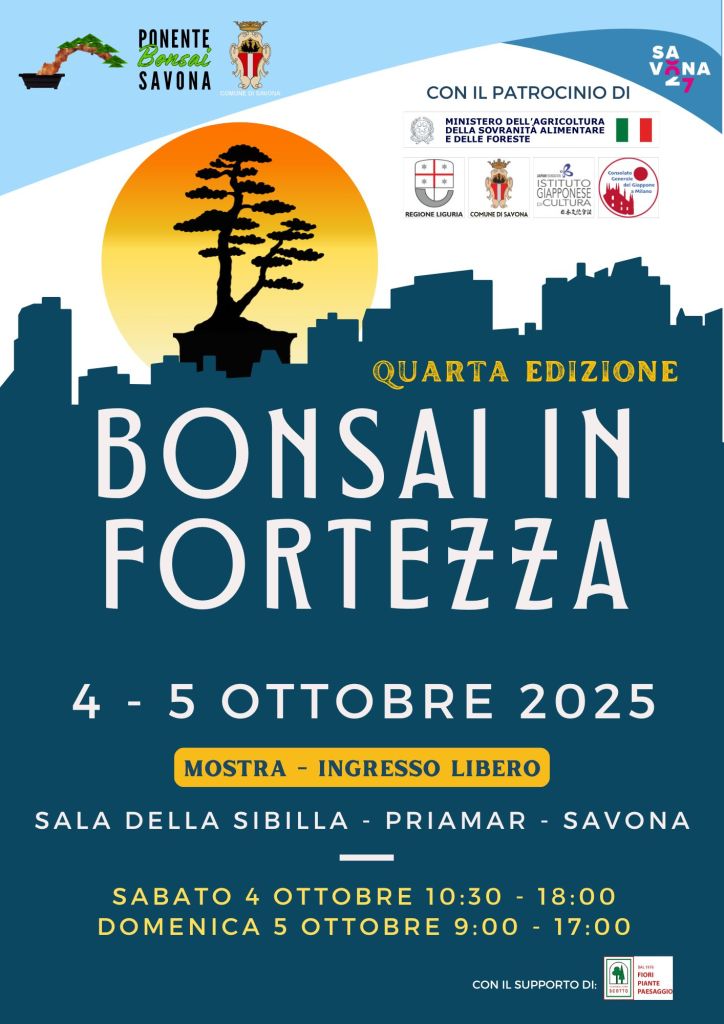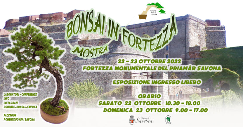 Nel mese di ottobre, la nostra Associazione organizza una mostra nella Fortezza del Priamar di Savona con 45 spazi espositivi suddivisi fra bonsai, suiseki e composizioni erbacee. Gli esemplari provengono da tutto il Nord Italia.